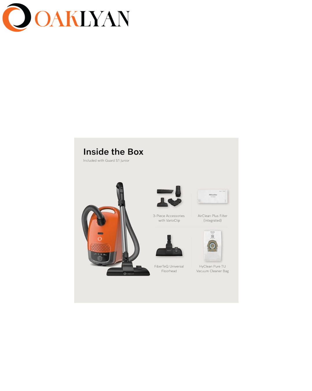 The Oaklyan Miele Guard S1 Junior Bagged Cylinder Vacuum Cleaner combines powerful cleaning performance with a lightweight, compact design ideal for everyday home use. Its advanced AirClean filtration system captures up to 99.99 % of fine dust, promoting cleaner air throughout your living space. Paired with a FiberTeQ universal floorhead, it glides smoothly across both carpets and hard floors for thorough cleaning. Featuring a ComfortFit bag system and ergonomic handle, this vacuum makes dirt disposal and handling easy and hygienic. With a generous 10 m operating radius and versatile accessory set, it’s perfect for efficient whole-home cleaning.